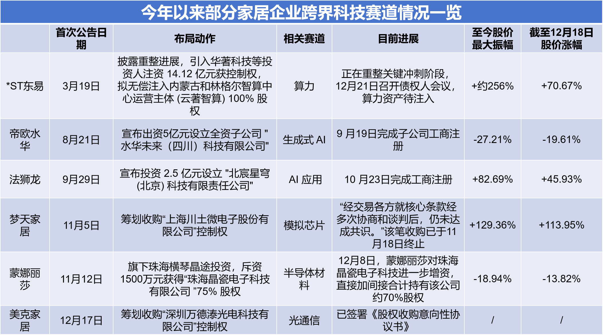 梦天家居不是个例,自公司跨界信息披露以来,*ST东易、法狮龙(605318)等公司股价也出现大幅上涨,股价最大涨幅达256%、82%。不过,也有公司股价并未因此进入上行通道。截至2025年12月18日,帝欧水华、蒙娜丽莎的股价较信息披露日下降超19%、13%。