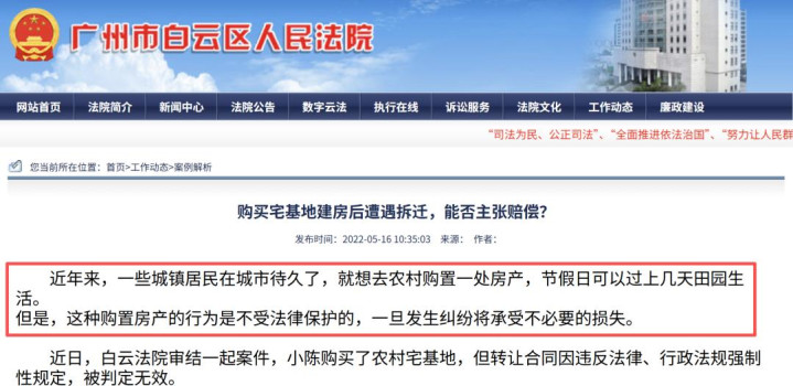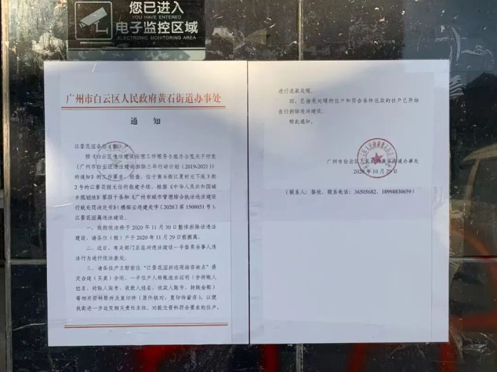 此外,在2020年,白云江景花园小产权房业主在住了20多年后,被通知违建拆除。同时,对提交资料符合要求的住户进行仅退款,对一手楼售卖人追责。