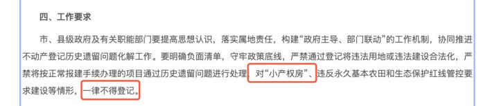 “严禁通过登记将违法用地或违法建设合法化,严禁将按正常报建手续办理的项目通过历史遗留问题进行处理,对‘小产权房’、违反永久基本农田和生态保护红线管控要求建设等情形,一律不得登记。”