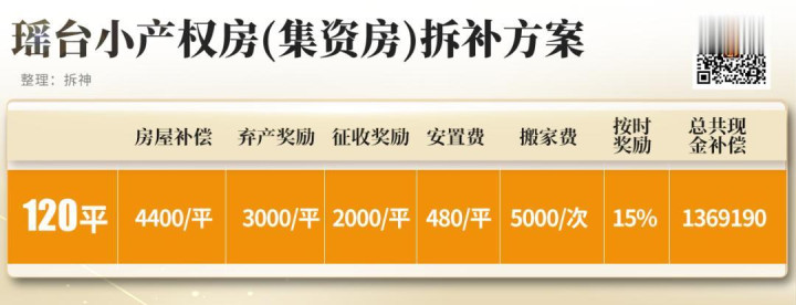 同样120平小产权房面积,该拆补方案只有48万元补偿,瑶台却有近137万,是前者给出的补偿方案接近3倍。