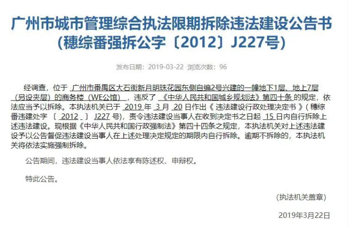 类似案例,还有番禺We公馆。其所在地块属大石街村集体土地,在未取得《建设工程规划许可证》的情况下,就建设了We公馆商务楼。